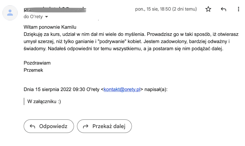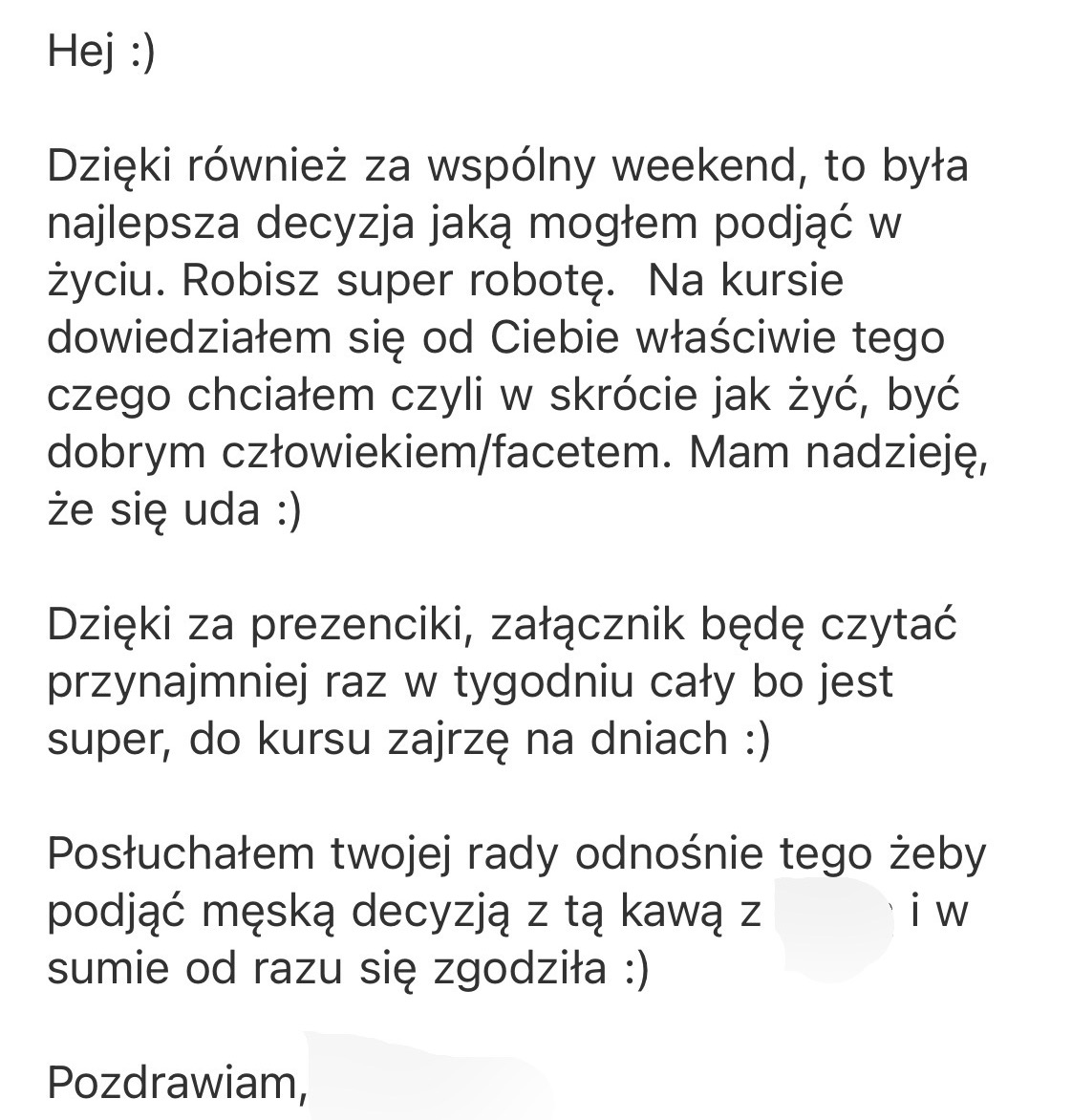 2. Seminarium są wyłącznie dla mężczyzn, dla których najważniejsza jest uczciwość oraz szczerość wobec kobiet. To oznacza zero manipulacji, socjotechnik, perswazji, uwodzenia, okłamywania czy wykorzystywania. Będziemy uczyli się, jak budować dojrzałe i pozytywne relacje z ludźmi i kobietami - oparte na uczciwości i odpowiedzialności.